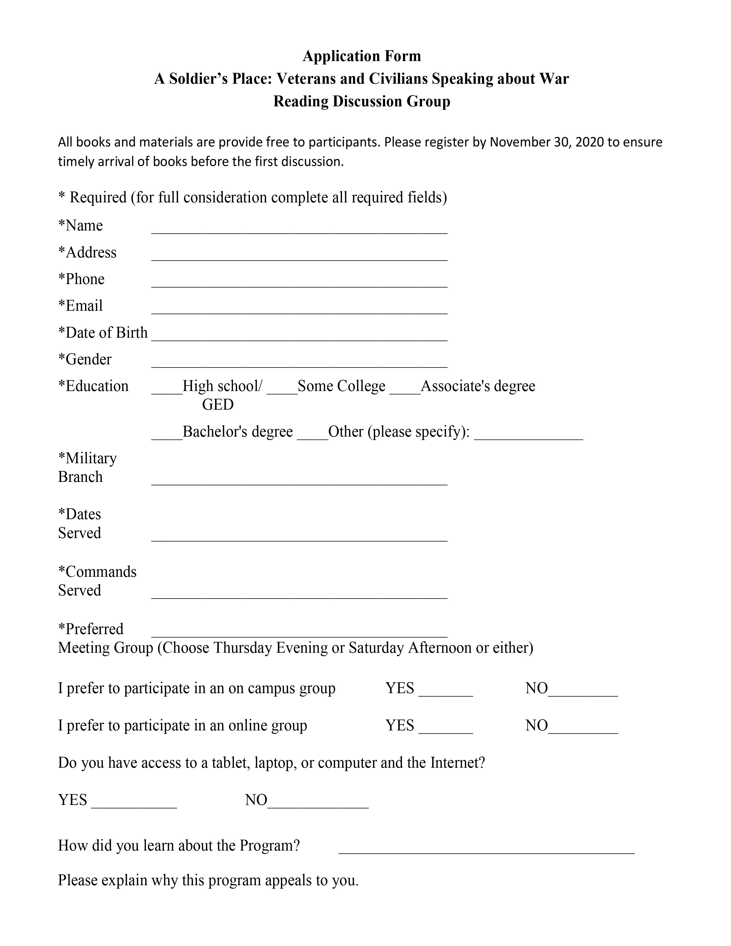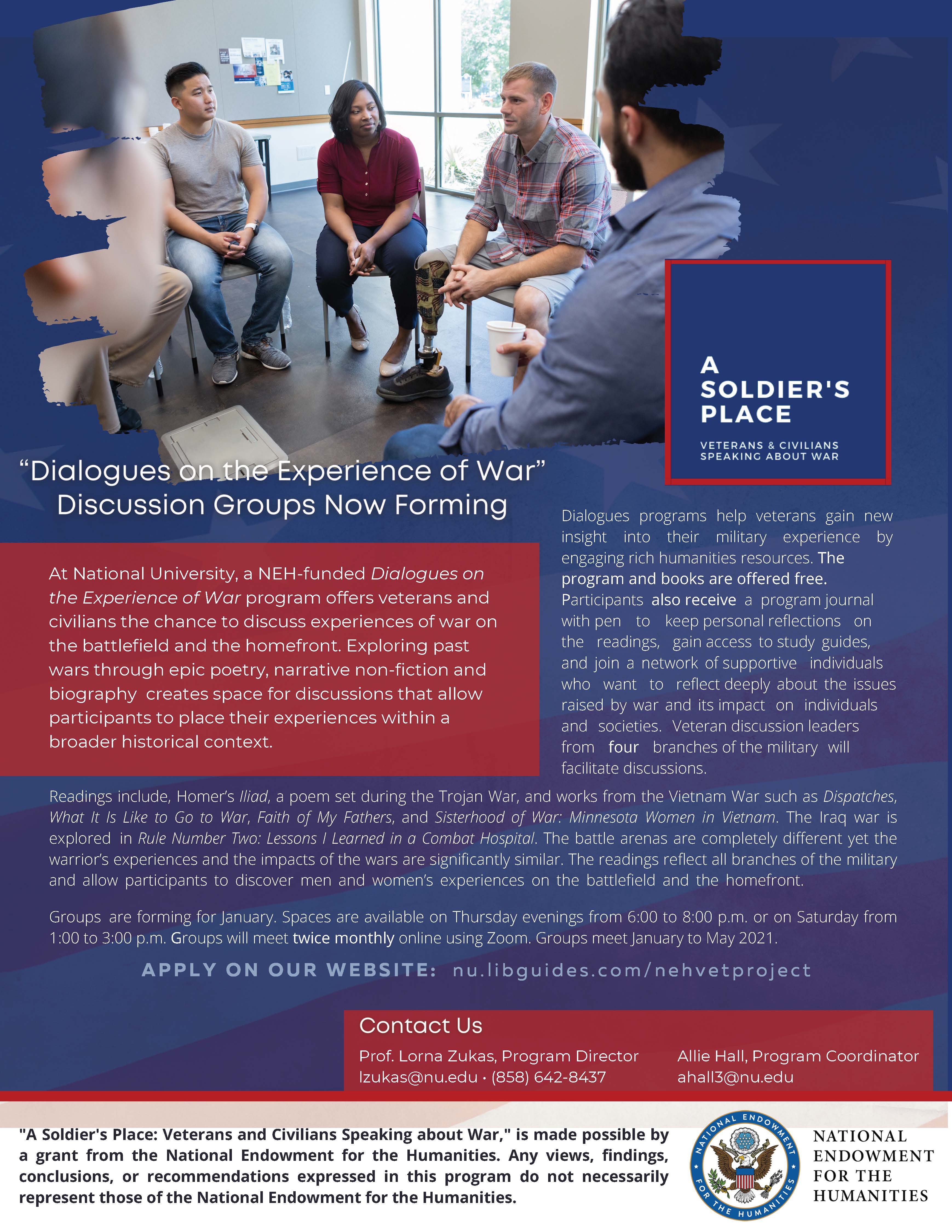 NEH Discussion Leaders serve as group facilitators for veterans and civilians who are interested in studying and understanding war. From January to May 2021, National University, with generous support from the National Endowment for the Humanities, hosted two discussion groups that met vi-weekly via Zoom to read and discuss humanities sources and share stories.